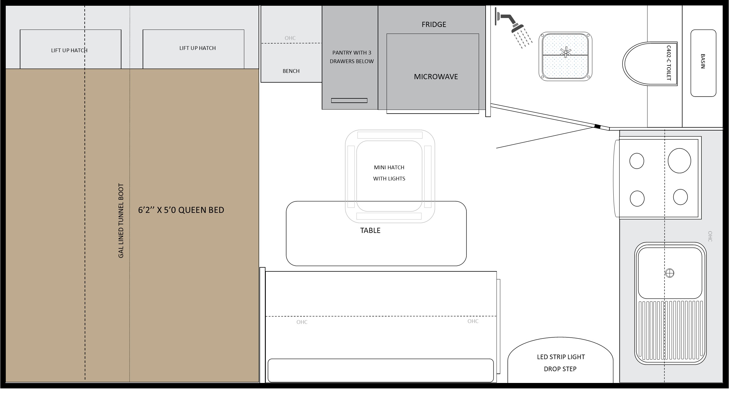 For a couple it can be a challenge to find a layout that has a comfortable bed, has access on both sides (so no crawling over the other person to get in/out of bed) while still keeping things as compact as possible. As a single, you can opt for the East/West bed layout which takes up less room than an island bed.