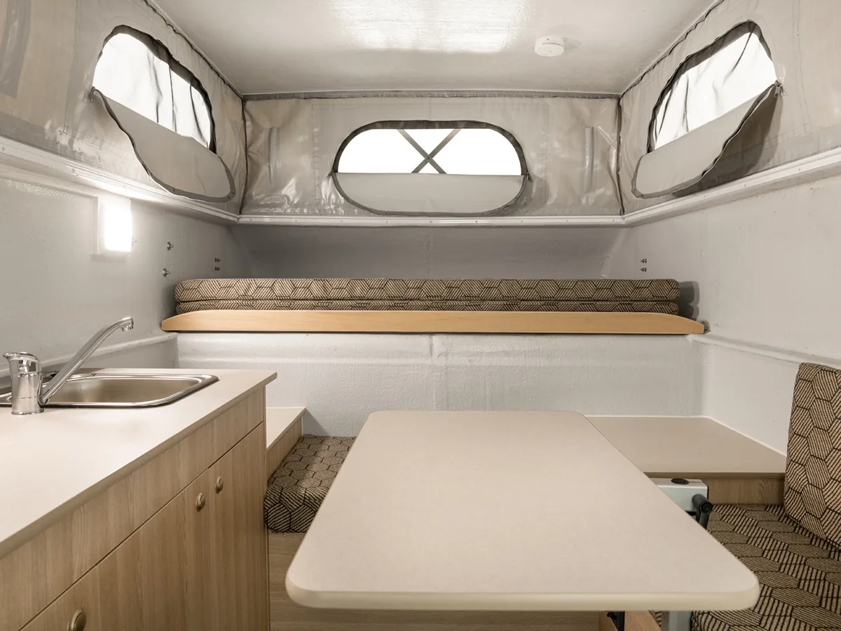The interior decor looks nice (yes, that’s important to me), optional pop-top, only 14ft body length and air-con as standard.