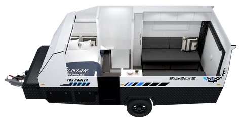 There are actually a number of smaller toy hauler camper trailer type rigs (where the toy hauler is a tray at the back of the camper, or a trailer with a roof top tent), but this one is a caravan with a permanent bed and bathroom.