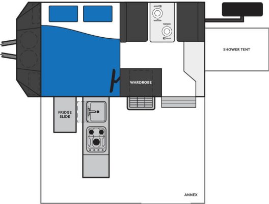 You get a north-south queen bed, internal kitchen and external kitchen with a fridge that can be accessed from either inside or outside, and even up to 250 litres of water capacity.