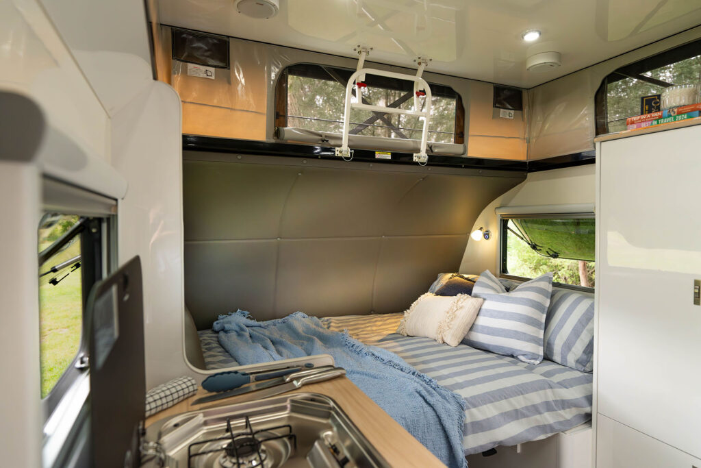 It’s got a tare of 1,600 kg and sleeps up to five — with a queen bed, bunks, and a single bunk tucked in under the queen bed..