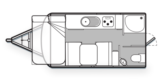 You’ve got a fold-out double bed extension at the front, a compact but proper bathroom with a separate shower and toilet, and even air con.