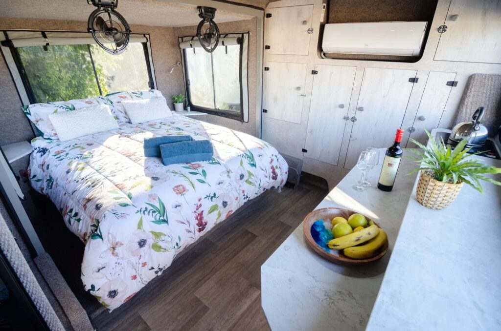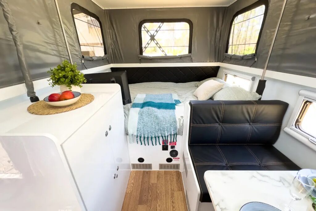Inside, the dinette converts to a double bed, and the finish feels more “tiny home” than “camper.”