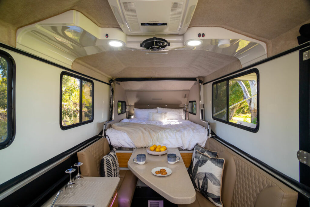 In return, you get a more caravan-like feel: solid walls, a roomy interior, and a layout that doesn’t feel like a compromise. At 6.1m long, it’s not small, but the pop-top helps cut down wind resistance.