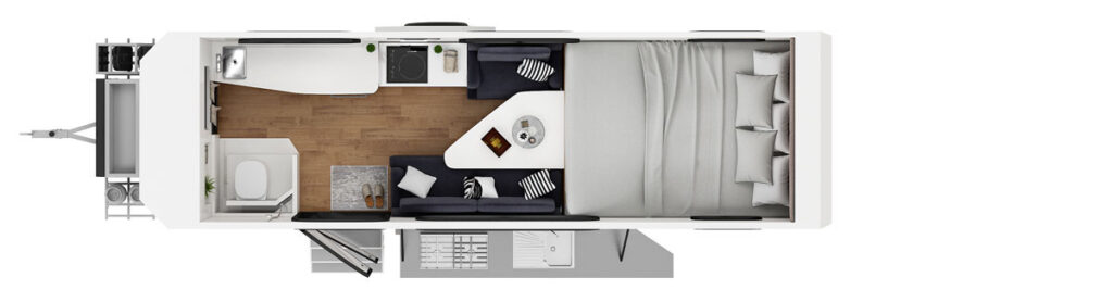 Inside, the layout is a familiar hybrid floorplan: a north-south bed, external slide-out kitchen, and a compact but functional bathroom. It’s not showy, but it’s practical, and the price really stands out — from $49,480, it’s the most affordable options on this list.